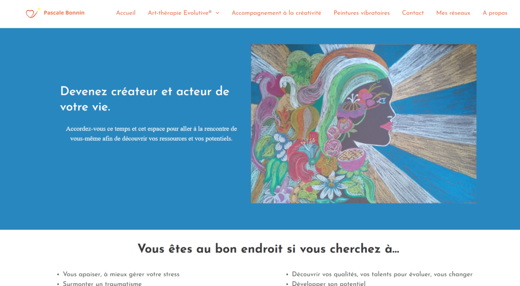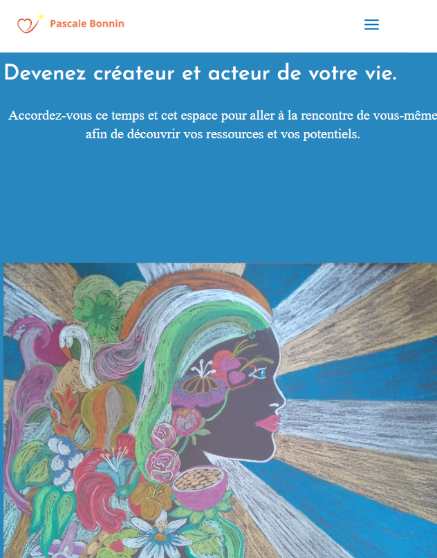 Mission durant un stage. Refonte du site WordPress d’une art-thérapeute. Le site n’était pas à jour et ressemblait à un fichier PDF. Toute les informations était sur la page d’accueil et il fallait dérouler la page en entier pour trouvais l’information qu’on souhaitais. J’ai créer des pages et des boutons. J’ai également fait la réalisation de l’ergonomie du site ainsi que porter une attention à la responsive. Le footer et le header était présent mais n’était pas utilisable. La couverture est son œuvre qu’elle utilise pour son identité.