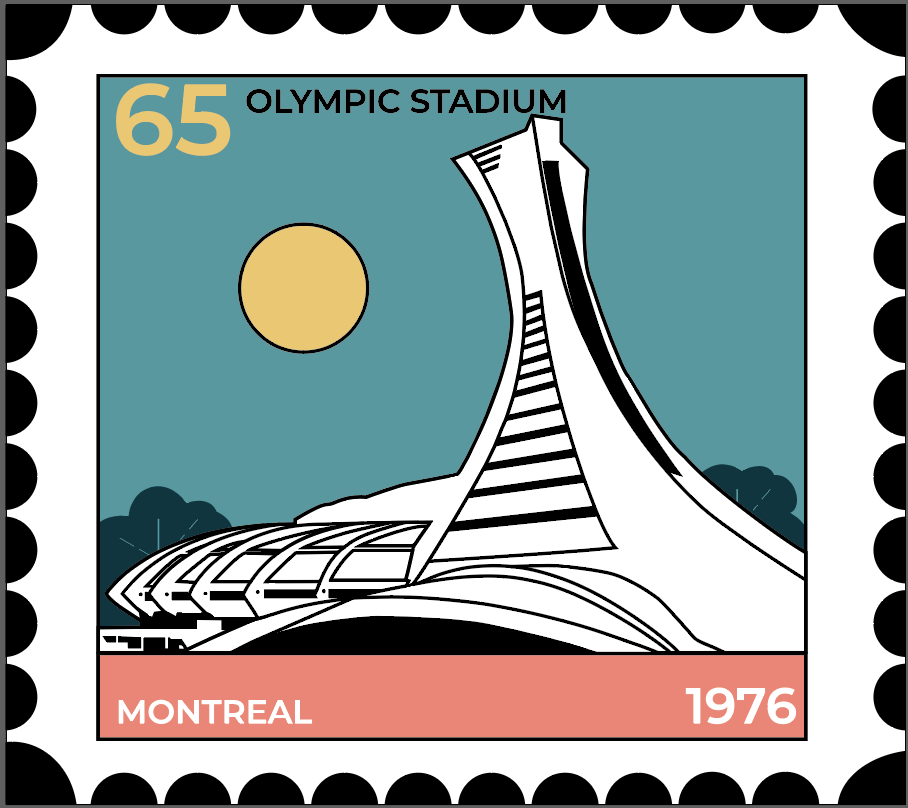Réalisation d’un timbre à la manière de Aleksandar Savic. Création du timbre en prenant le stade olympique de Montréal.